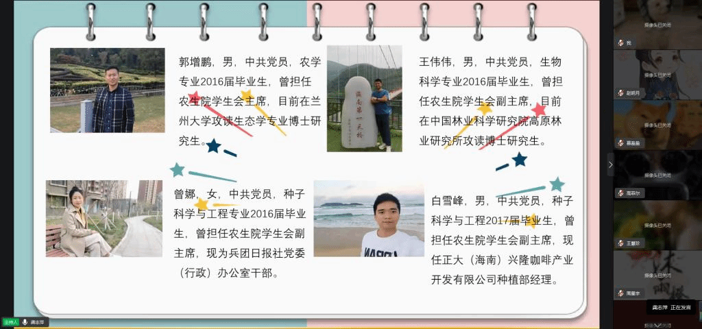 会上,四位历届主席团成员:兰州大学在读博士、中国林科院在读博士、新疆维吾尔自治区兵团日报社党办公室干部、正大集团种植线种植部经理,结合自身成长、求学及工作经历,分别以“踏实、选择、行动、信念—我的员工会经历与职业规划”;“让青春在奋斗中绽放光芒—以自身为例谈员工骨干如何处理工作和学习的关系”;“浅谈就业与选择”;“在校老员工如何提高自身的就业竞争力”等为主题并予以勉励和建议,一是善于反思和碎片化学习、善于创新工作方法和思路,提升学习、工作效率;二是强化服务意识,从服务中提升个人的综合素养;三是多实践,不断积累社会经验,掌握专业技能;四是树立正确的就业观、择业观,明确职业规划。自由提问环节,员工会成员从不同方面进行了深入交流。