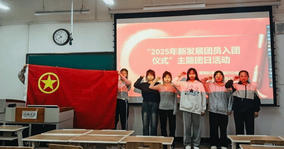 入团仪式上,团支部书记、优秀团员代表为新发展团员代表颁发团章、团员学习笔记本,佩戴团徽。全体团员胸戴团徽,举起右拳,面向团旗,庄严宣誓,充分展现了团员青年积极向上、奋发有为的青春风采,表达了新团员们为共产主义事业奋斗终身的坚定决心。优秀团员和新团员代表作表态发言,纷纷表示要努力学习,知行合一,以更高的标准要求自己,用实际行动践行“请党放心,强国有我”的青春誓言。