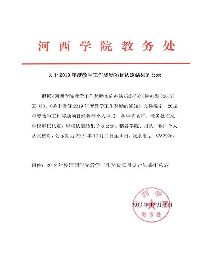 关于2019年度伟德国际1946教学工作奖励项目认定结果的公示